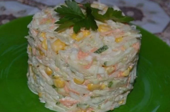 - Într-un bol mare, combină varza, castravetele, morcovul, porumbul și usturoiul zdrobit.